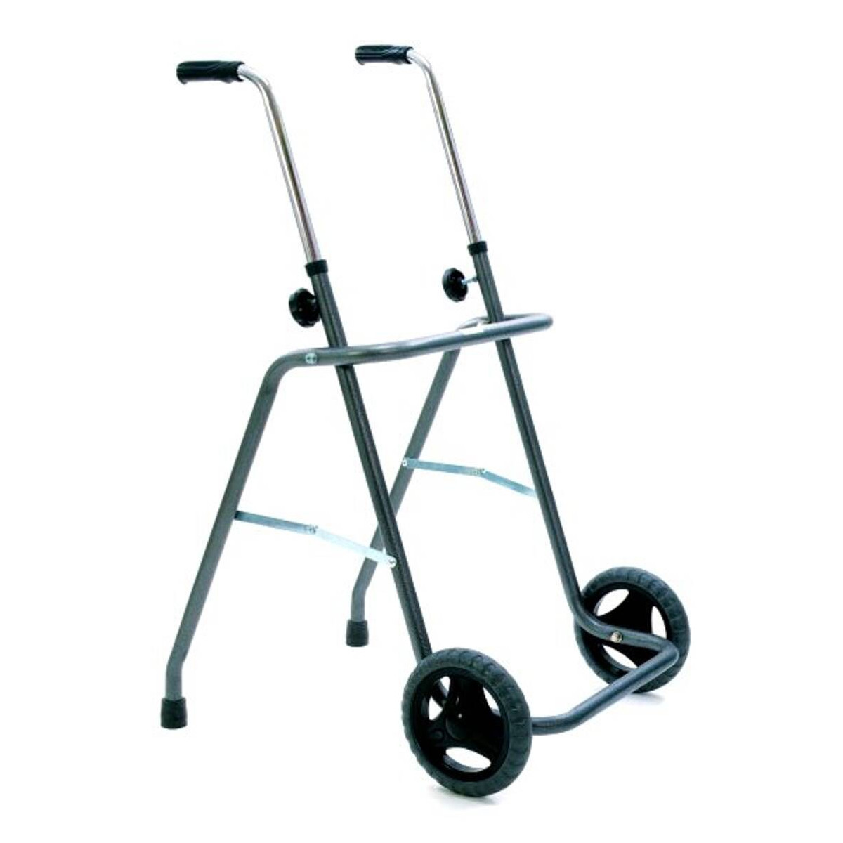 Rollator pieghevole con due ruote di 20 cm. di diametro adatte anche per l’esterno, e due puntali posteriori. Struttura in tubolare di acciaio verniciato grigio. Impugnature regolabili in altezza. Si piega e si trasporta con facilità.