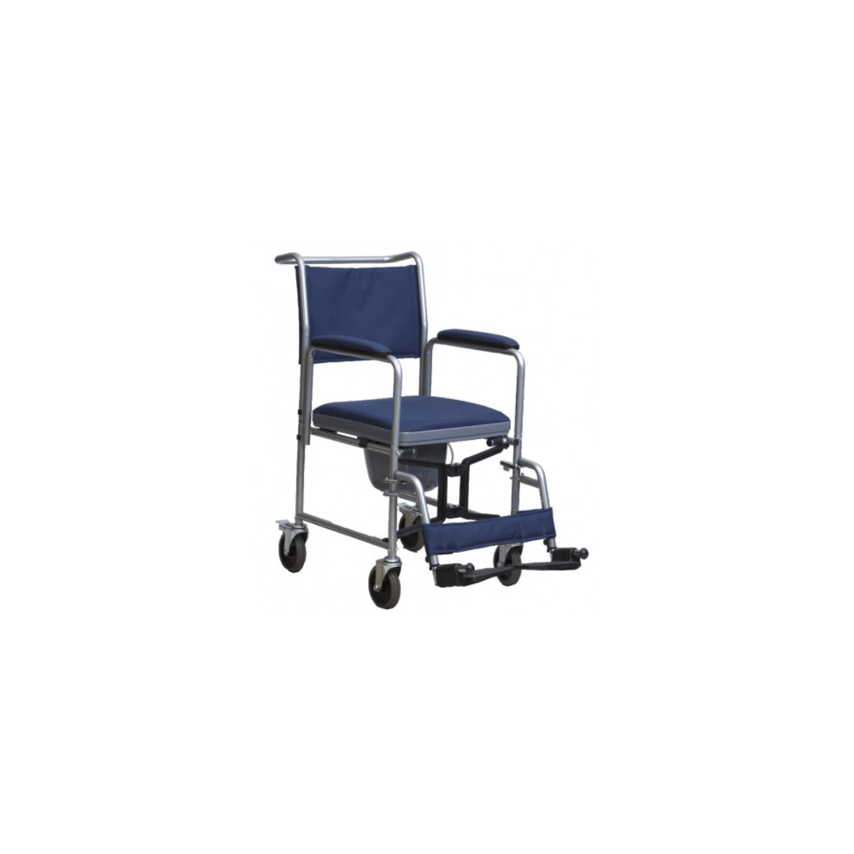 La struttura in acciaio verniciato grigio è robusta, completamente pieghevole e smontabile per ridurre l'ingombro quando non in uso. Dotata di 4 ruote piroettanti, con sistema di bloccaggio sulle posteriori, e maniglione ergonomico, garantisce spostamenti sicuri e agevoli. Braccioli e schienale sono imbottiti ed estraibili, mentre le pedane sono regolabili in altezza e ribaltabili.