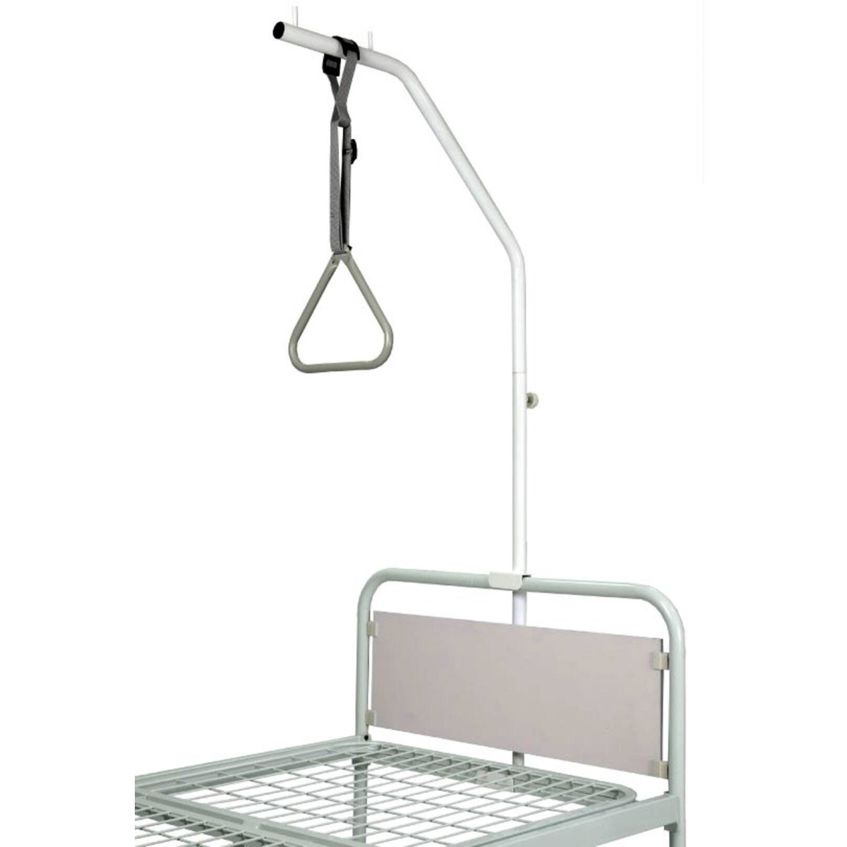 La struttura è realizzata in robusto tubolare di acciaio verniciato bianco, un materiale che assicura stabilità e resistenza nel tempo. La particolarità di questo modello risiede nella sua versatilità: la posizione della struttura può essere regolata in base alle specifiche necessità del Paziente, così come l'altezza del triangolo alzapersone, grazie alla cinghia regolabile inclusa. Gli attacchi e i fermi antiscivolo sono saldati direttamente al corpo principale per prevenire qualsiasi cedimento o spostamento accidentale.
