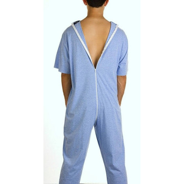 Il pigiama sanitario per uomo Art. 1010 è realizzato in fresco jersey di puro cotone, una soluzione ideale per il periodo estivo. La struttura a manica corta e gamba lunga garantisce freschezza alla Persona pur mantenendo la protezione necessaria lungo gli arti inferiori. La cerniera posta sulla schiena scende dalla base del collo fino alla zona addominale: posizionando il cursore sul dorso, si impedisce al Paziente l’apertura volontaria del capo, evitando lo svestimento o la manipolazione del pannolone.